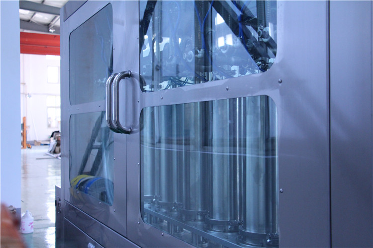 - 11. Enostavna prilagoditev prostornine in hitrosti polnjenja, ko se nobena plastenka ne vloži ali ne vloži materiala, se stroj samodejno ustavi. Usta polnila imajo napravo proti kapljanju.